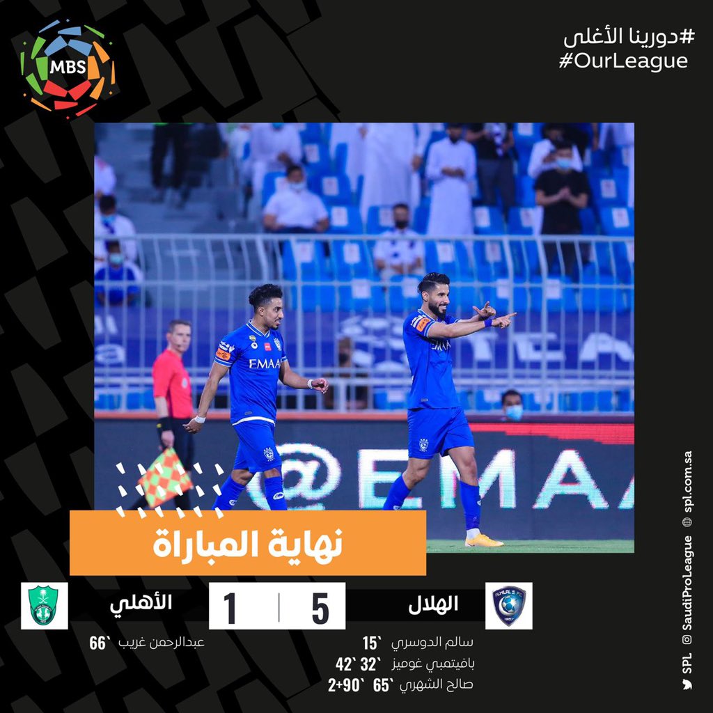 ويحتل الهلال المركز الثاني في ترتيب دوري المحترفين، برصيد 24 نقطة، بفارق 5 نقاط ومباراتين، عن النصر المتصدر، بينما يأتي الأهلي في المركز الرابع، برصيد 23 . 5 الأهليالهلال'32 تراوري'65 محمد ا .